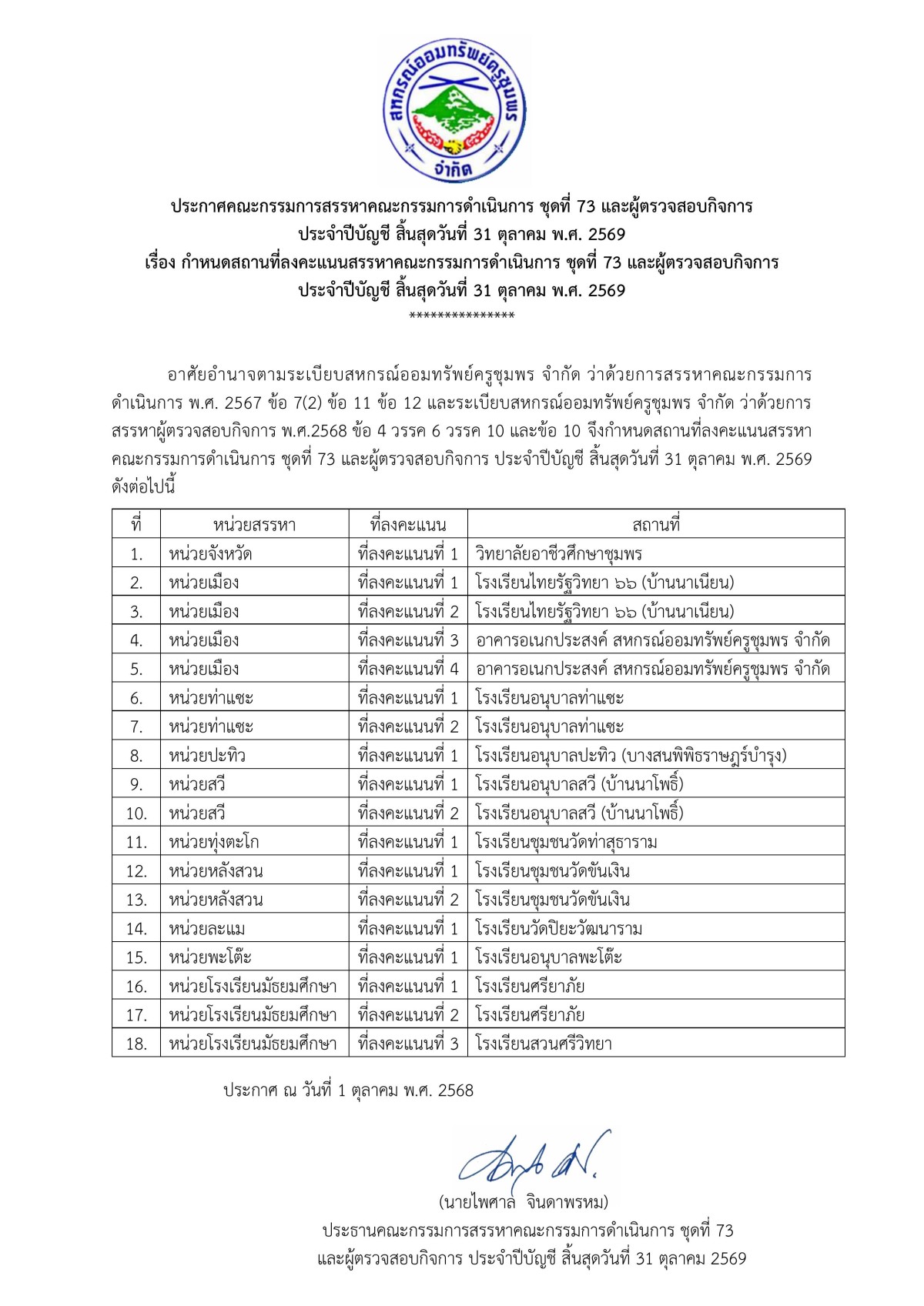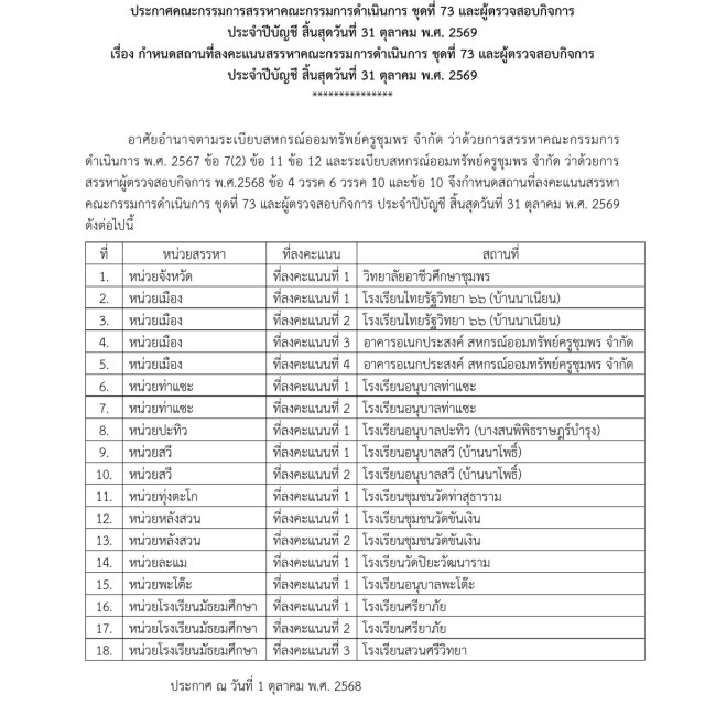 กำหนดสถานที่ลงคะแนนสรรหาคณะกรรมการดำเนินการ ชุดที่ 73 และผู้ตรวจสอบกิจการ ประจำปีบัญชีสิ้นสุดวันที่ 31 ตุลาคม พ.ศ. 2569