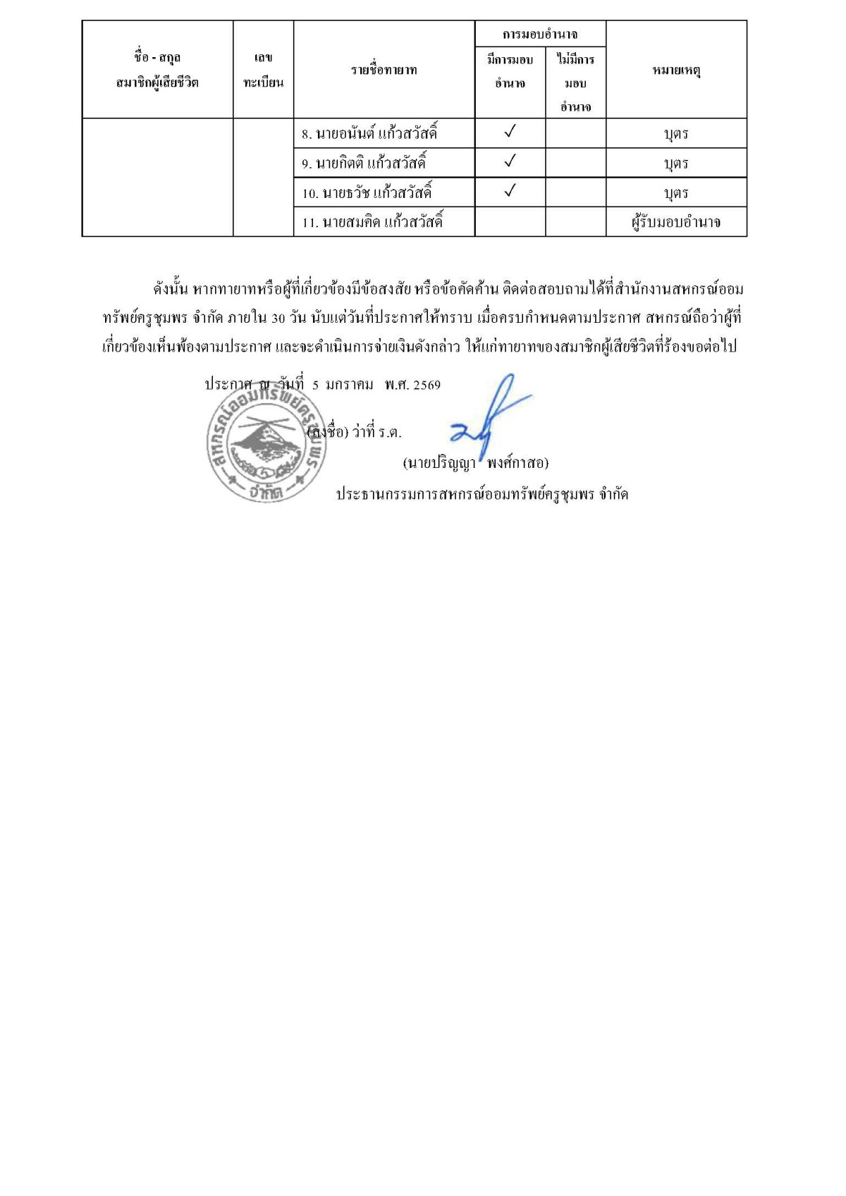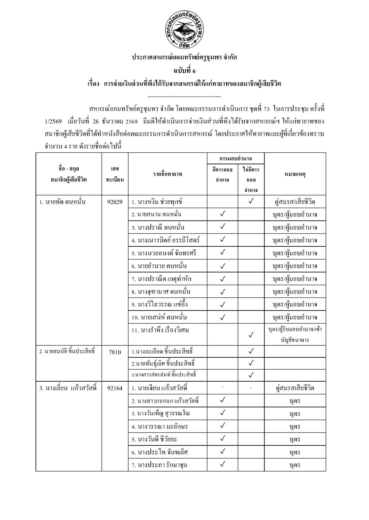 การจ่ายเงินส่วนที่พึงได้รับจากสหกรณ์ให้แก่ทายาทของสมาชิกผู้เสียชีวิต (เดือนธันวาคม 2568)