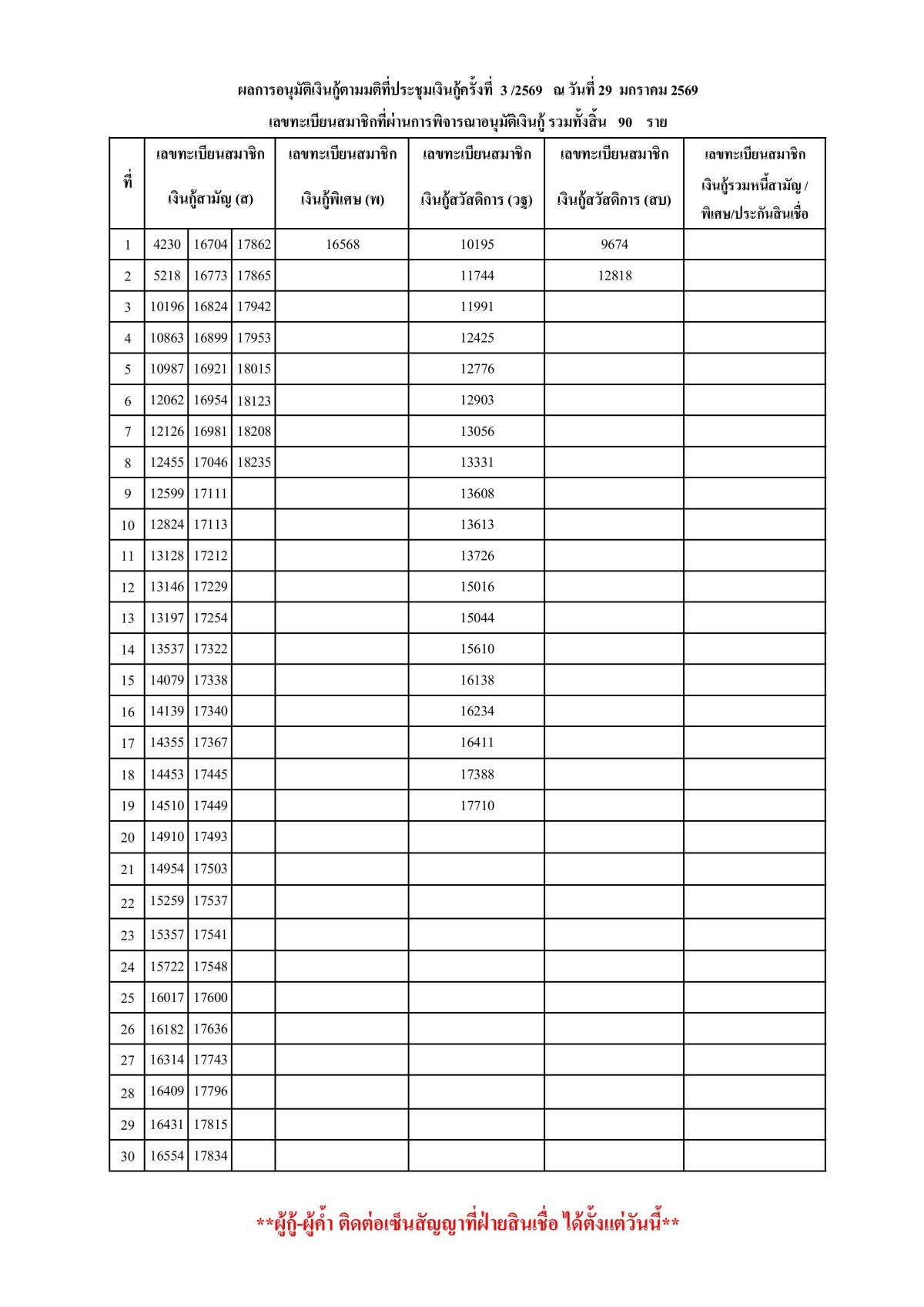 ผลการอนุมัติเงินกู้ตามมติที่ประชุมเงินกู้ครั้งที่ 3/2569 ณ วันที่ 29 มกราคม 2569