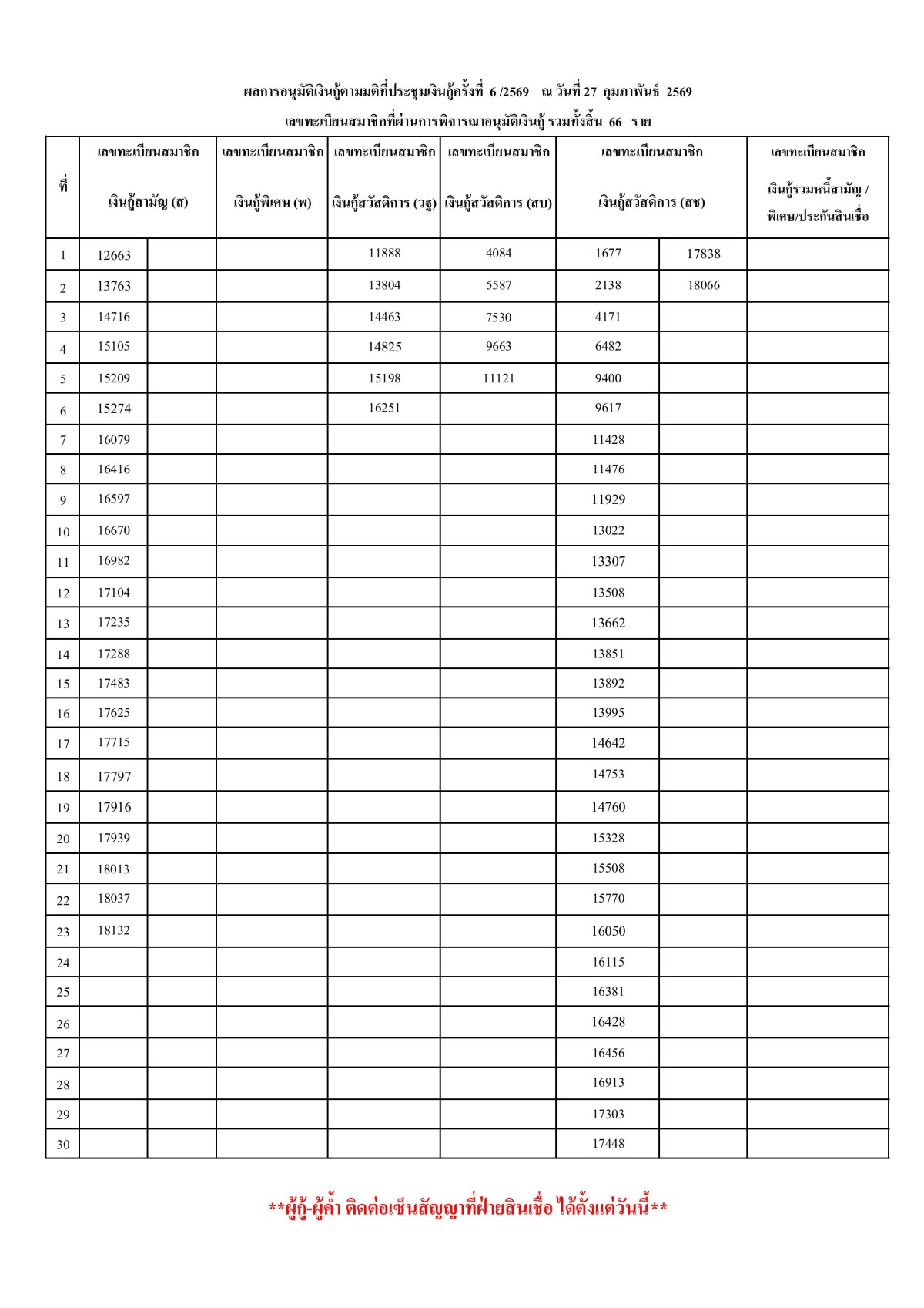 ผลการอนุมัติเงินกู้ตามมติที่ประชุมเงินกู้ครั้งที่ 6/2569 ณ วันที่ 27 กุมภาพันธ์ 2569