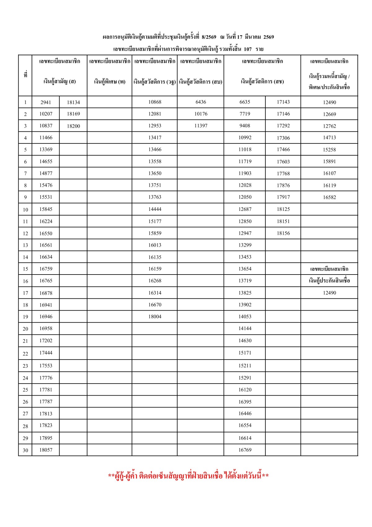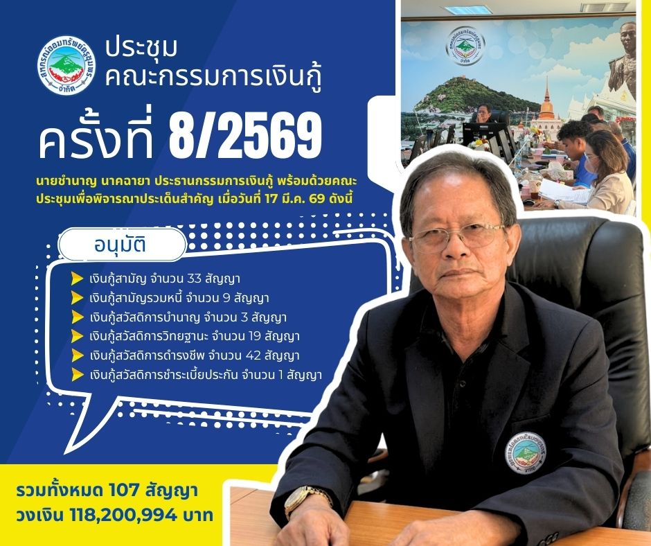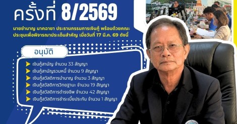 ผลการอนุมัติเงินกู้ตามมติที่ประชุมเงินกู้ครั้งที่ 8/2569 ณ วันที่ 17 มีนาคม 2569