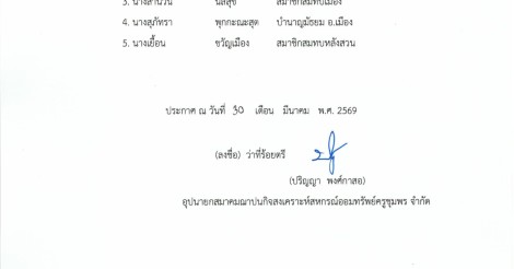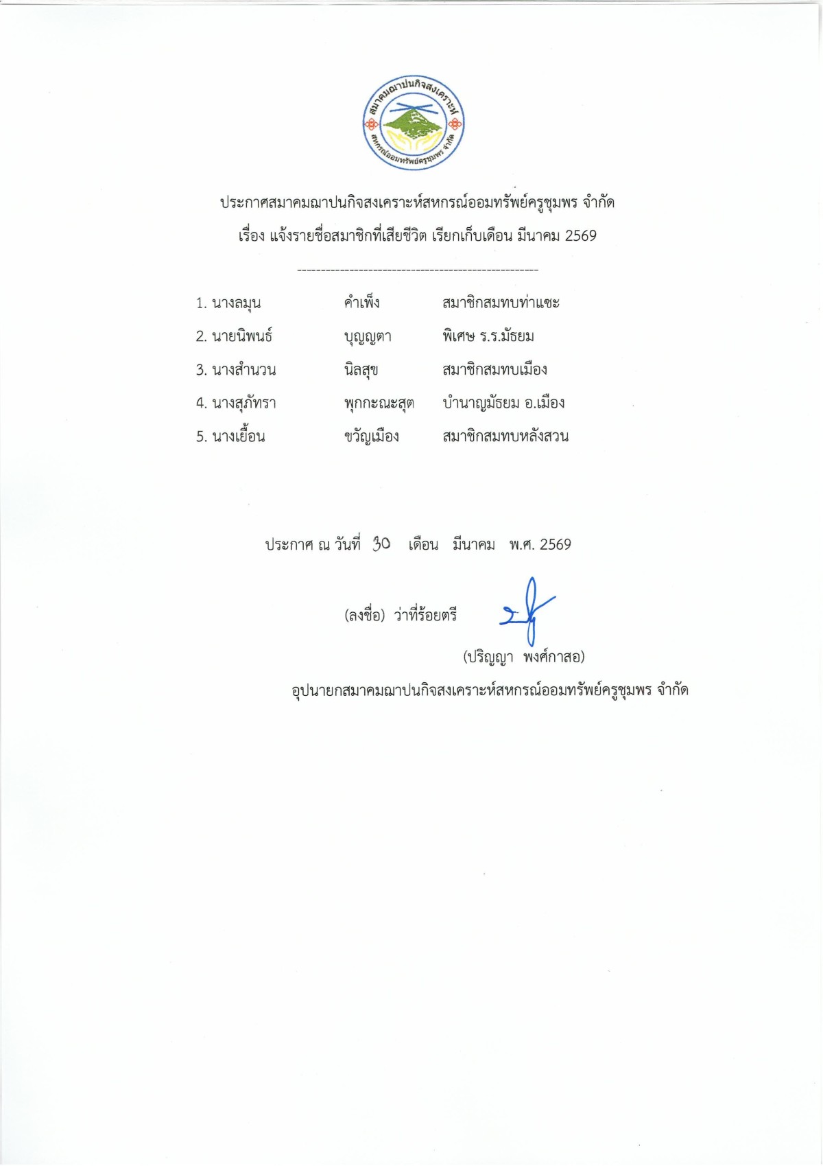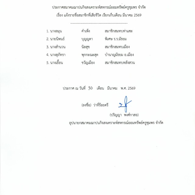 แจ้งรายชื่อสมาชิกเสียชีวิต เรียกเก็บเดือนมีนาคม 2569