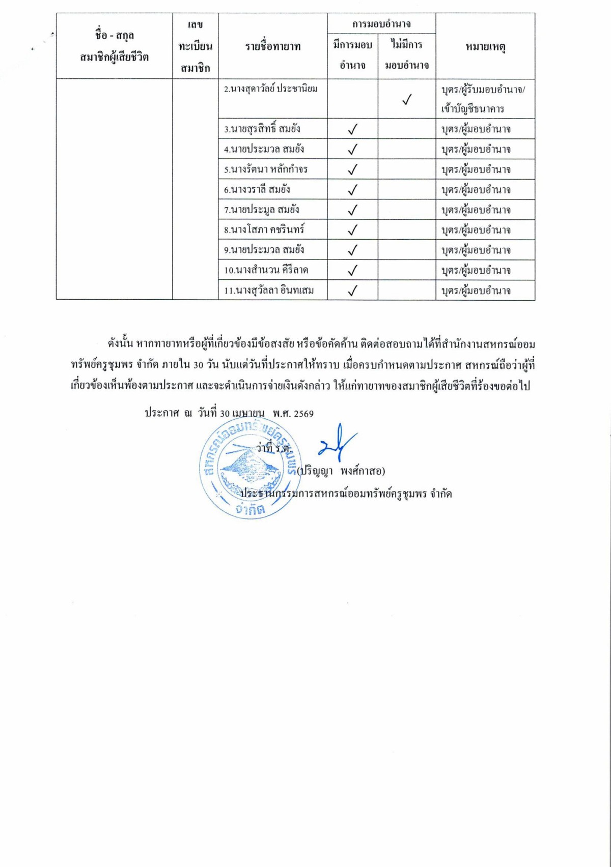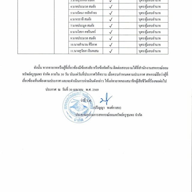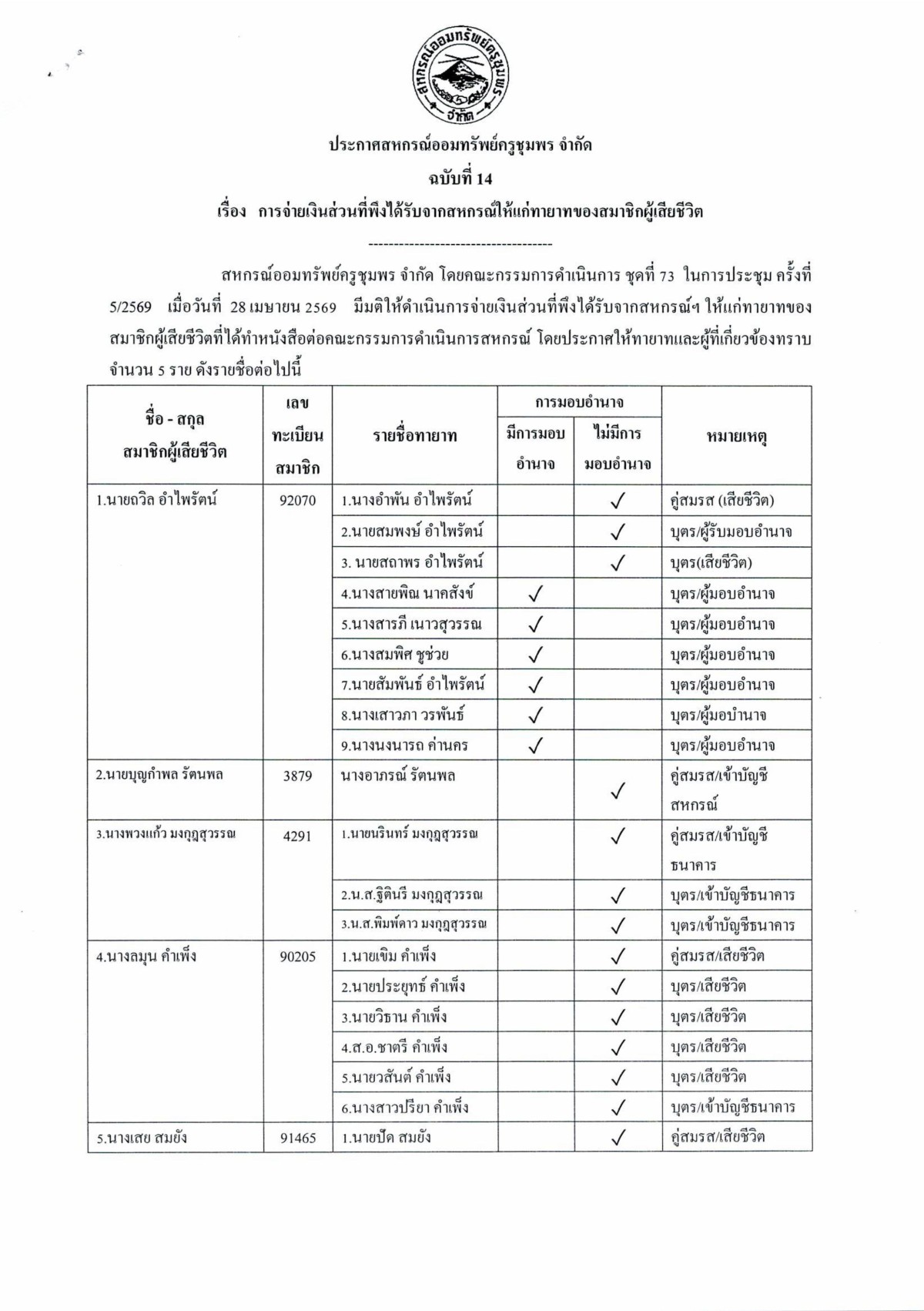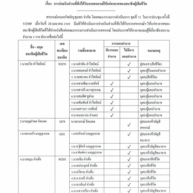 การจ่ายเงินส่วนที่พึงได้รับจากสหกรณ์ให้แก่ทายาทของสมาชิกผู้เสียชีวิต (เดือนเมษายน 2569)