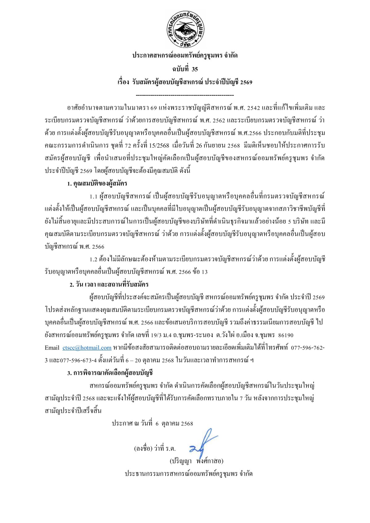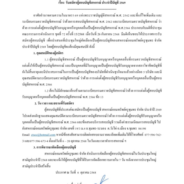 รับสมัครผู้สอบบัญชีสหกรณ์ ประจำปีบัญชี 2569
