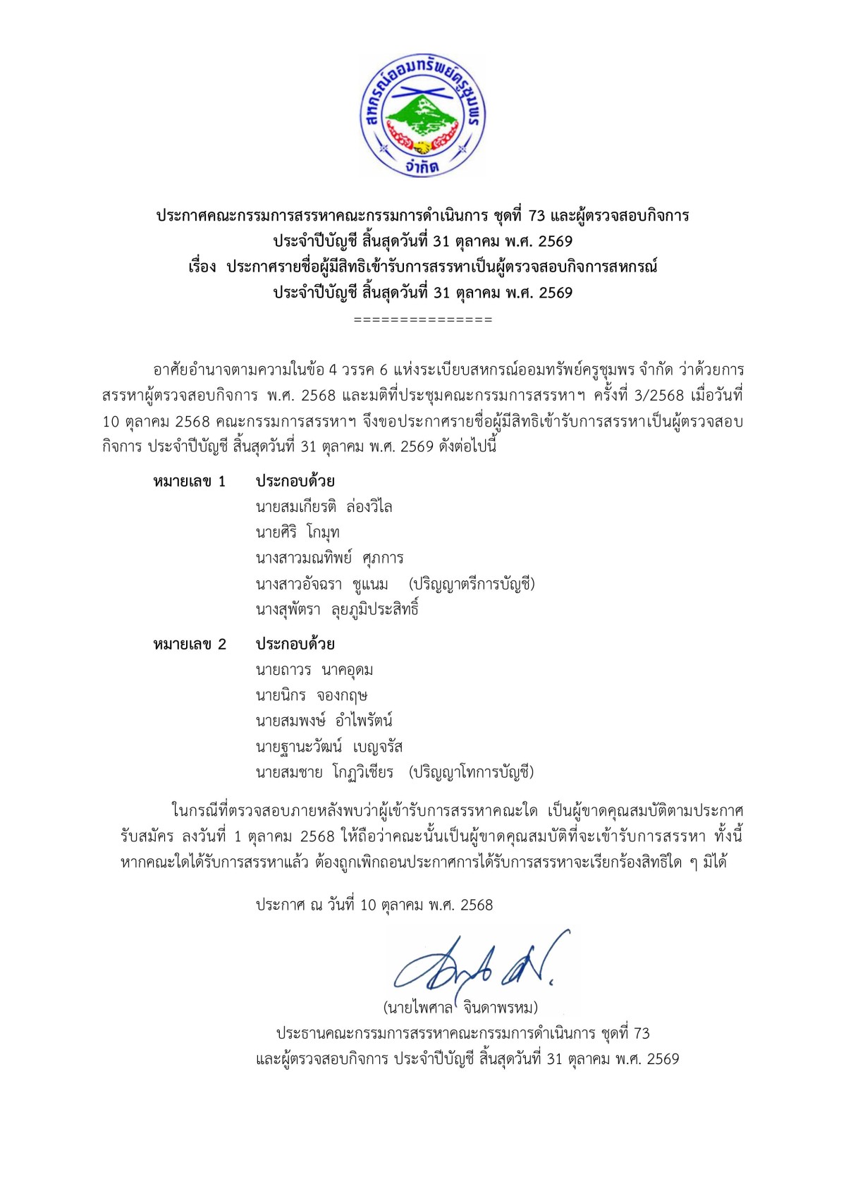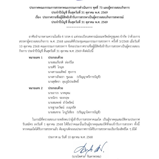 รายชื่อผู้มีสิทธิเข้ารับการสรรหาเป็นผู้ตรวจสอบกิจการ ประจำปีบัญชีสิ้นสุดวันที่ 31 ตุลาคม พ.ศ. 2569