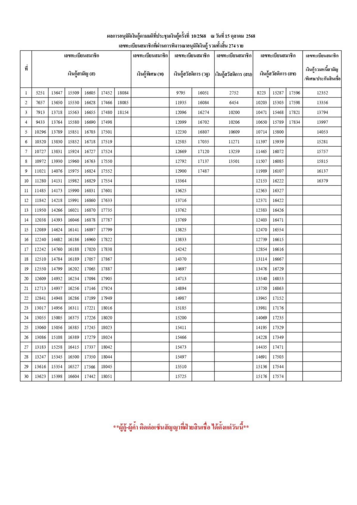 ผลการอนุมัติเงินกู้ตามมติที่ประชุมเงินกู้ครั้งที่ 10/2568 ณ วันที่ 15 ตุลาคม 2568