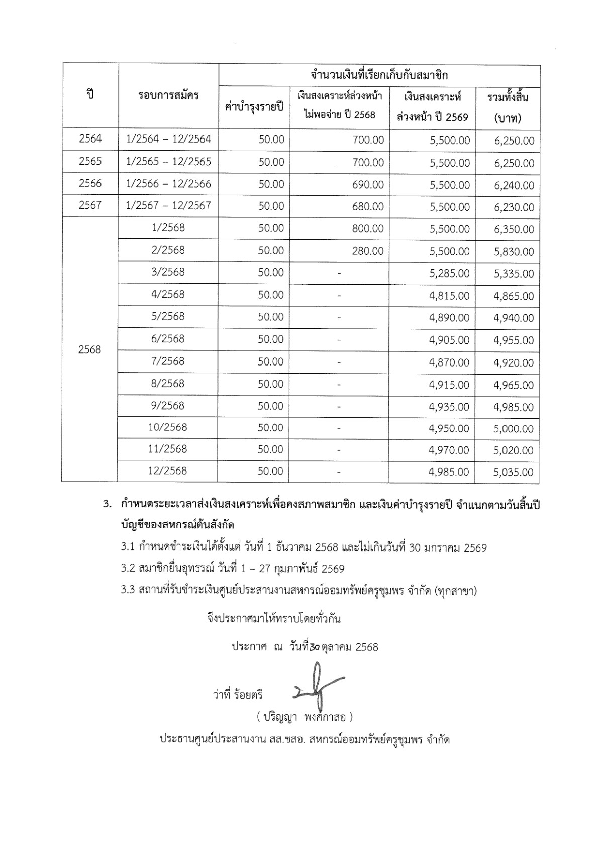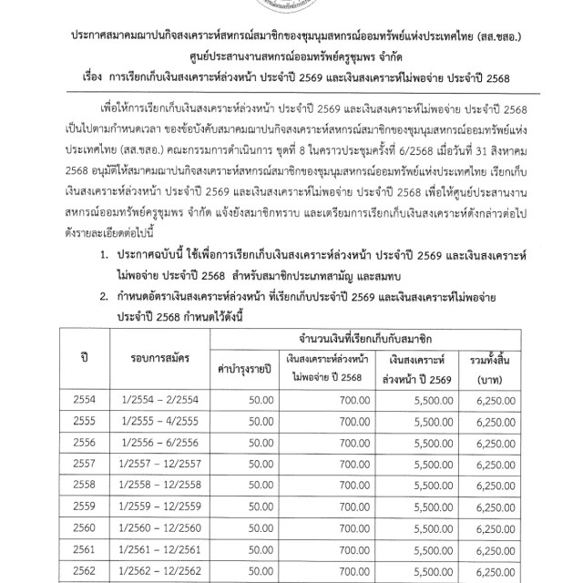 สส.สก.กำหนดอัตราเงินสงเคราะห์ และระยะเวลาการชำระเงินสงเคราะห์ล่วงหน้า ประจำปี 2569