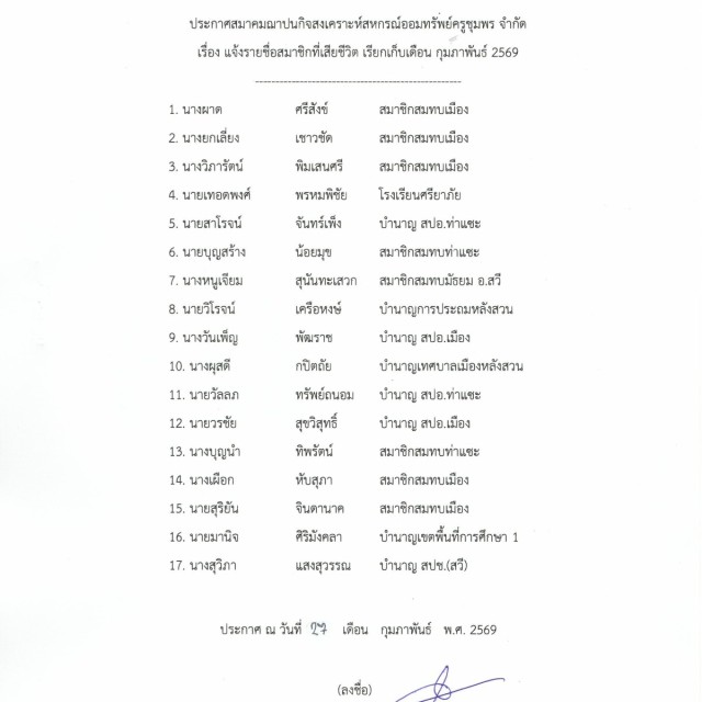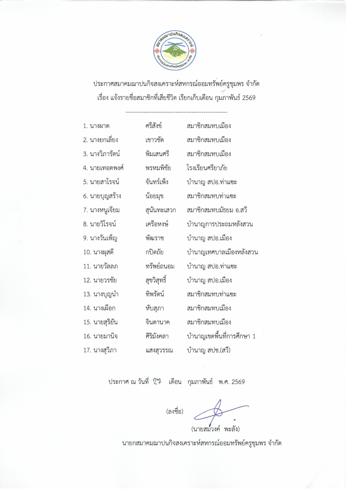 แจ้งรายชื่อสมาชิกเสียชีวิต เรียกเก็บเดือนกุมภาพันธ์ 2569