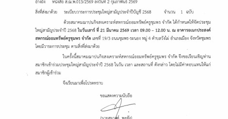 ขอเชิญประชุมใหญ่สามัญประจำปีบัญชี 2568 สมาคมฌาปนกิจสงเคราะห์ สอ.ครูชุมพร จำกัด